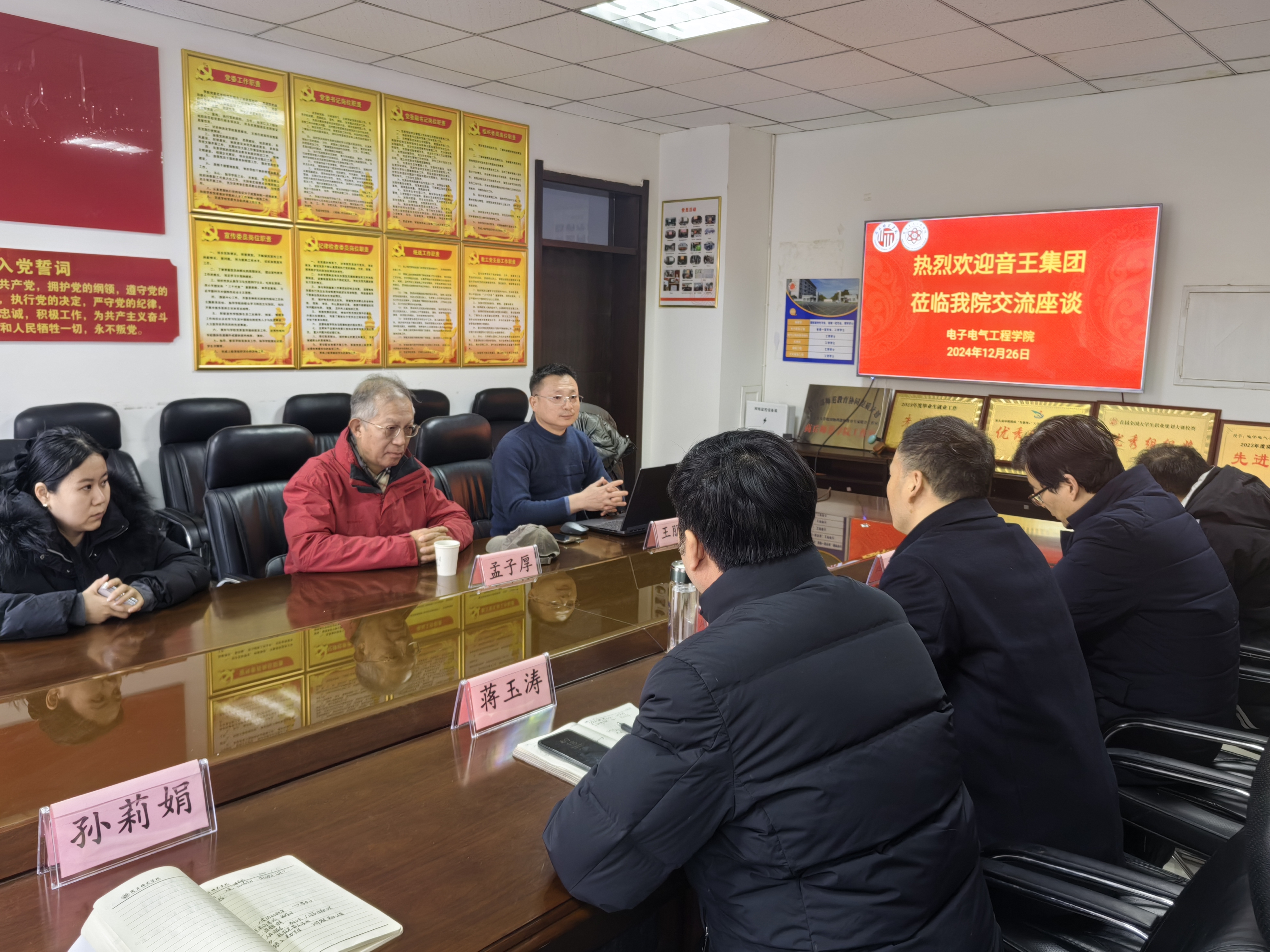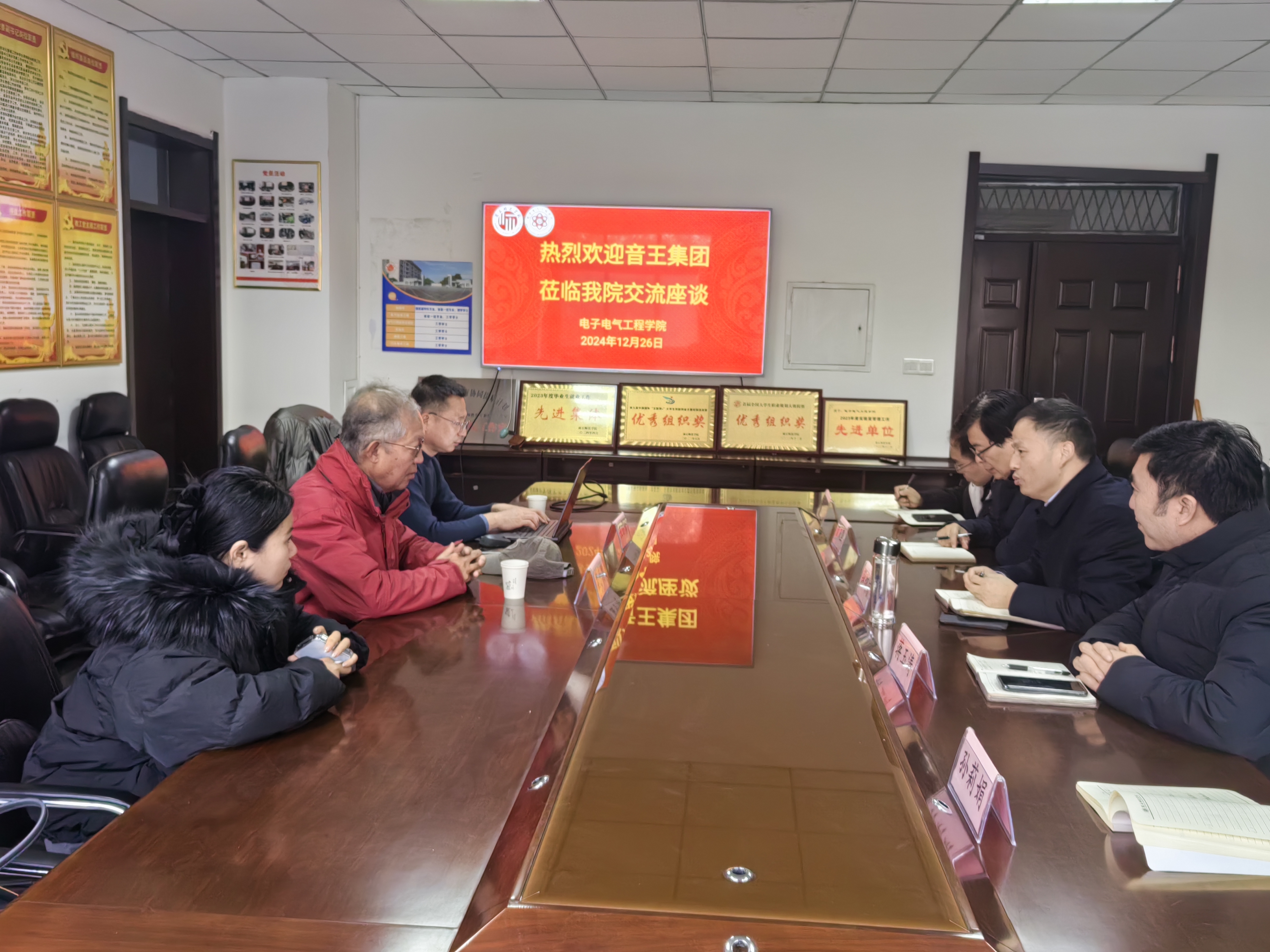 12月26日,音王集团研发副总监王朋珍、中国传媒大学博士生导师孟子厚教授一行来到我院开展校地合作洽谈。我院院长赵纲领、副书记蒋玉涛、副院长曾庆国、实验中心主任麻焕锋、学工办主任孙莉娟出席座谈会。