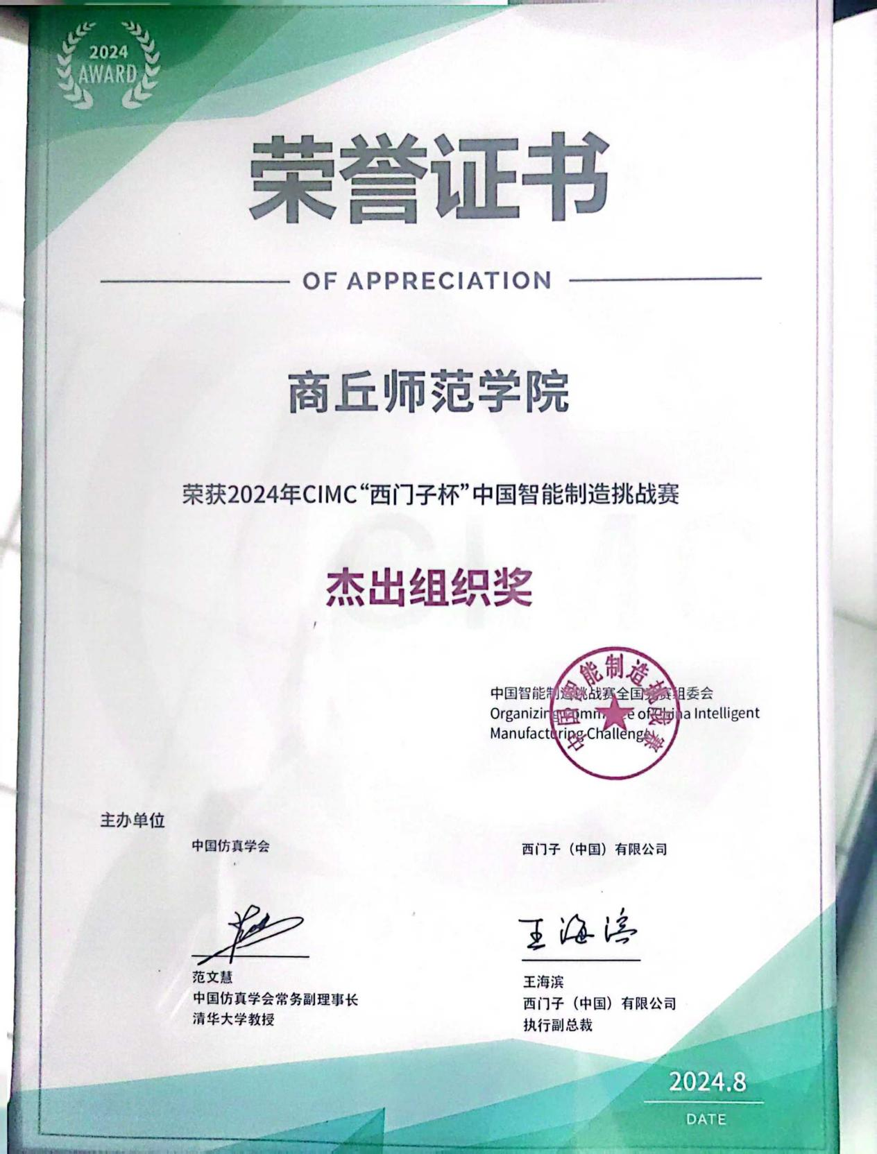 2024年CIMC“西门子杯”中国智能制造挑战赛杰出组织奖